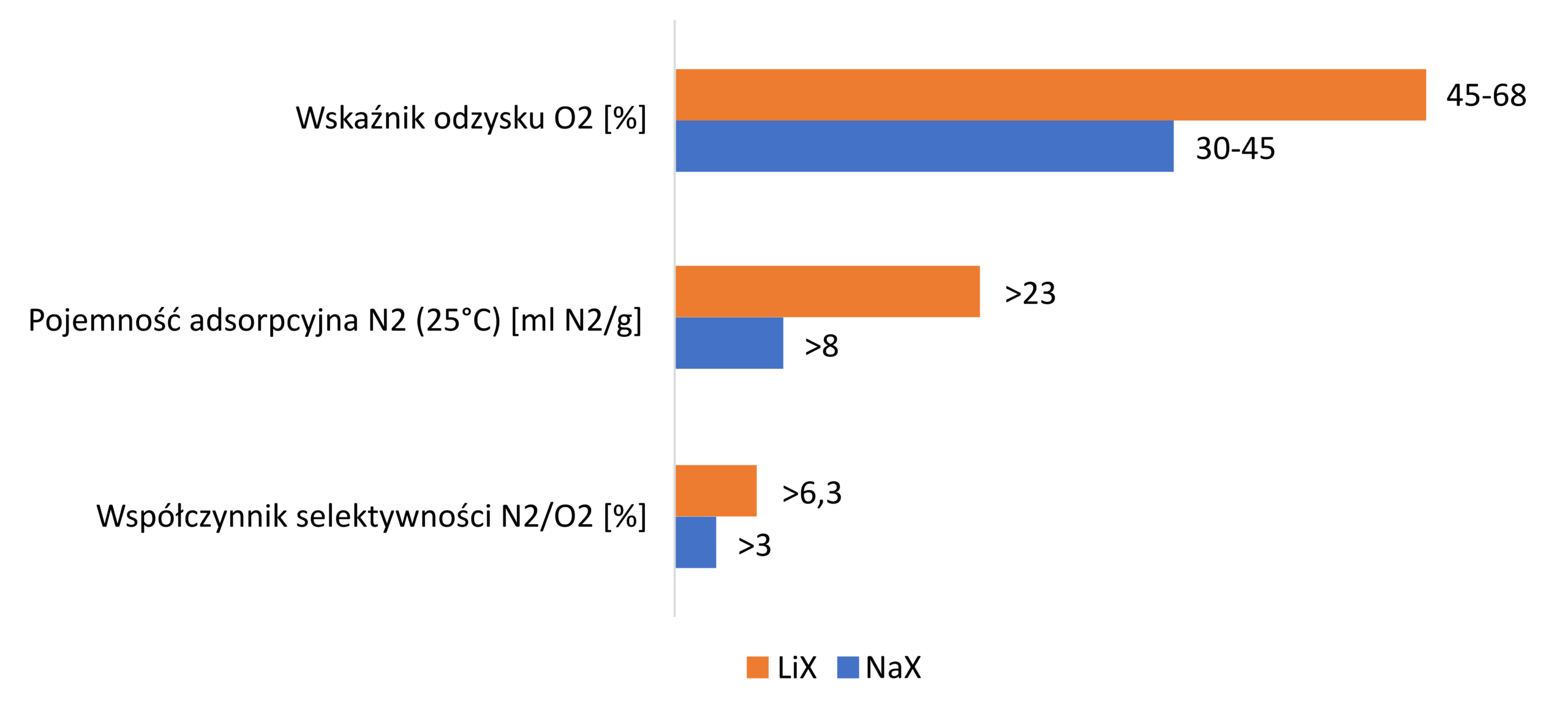 Sita molekularne typu NaX charakteryzują się niższym kosztem zakupu oraz większą tolerancją na odchylenia od warunków pracy. Znajdują zastosowanie przede wszystkim w podstawowych modelach koncentratorów tlenu o mniejszej wydajności. Ze względu na umiarkowaną selektywność względem azotu i niższą pojemność adsorpcyjną, ich stosowanie może wiązać się z koniecznością zastosowania większych objętości złoża lub akceptacją niższej sprawności procesu. NaX to rozwiązanie odpowiednie tam, gdzie liczy się prostota, dostępność materiału i ograniczony budżet inwestycyjny.